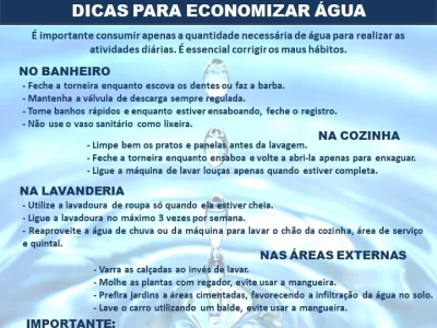 DICAS PARA ECONOMIZAR ÁGUA É importante consumir apenas a quantidade necessária de água para realizar as atividades diárias. É essencial corrigir os maus hábitos. COMPARTILHAR facebook messenger twitter whatsapp outras mídias