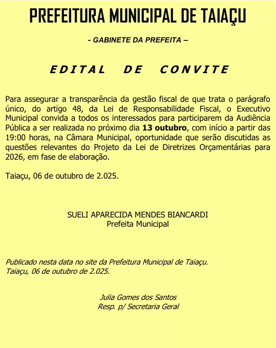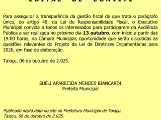 Para assegurar a transparência da gestão fiscal de que trata o parágrafo único, do artigo 48, da Lei de Responsabilidade Fiscal, o Executivo Municipal convida a todos os interessados para participarem da Audiência Pública a ser realizada no próximo dia 13 outubro, com início a partir das 19:00 horas, na Câmara Municipal, oportunidade que serão discutidas as questões relevantes do Projeto da Lei de Diretrizes Orçamentárias para 2026, em fase de elaboração.